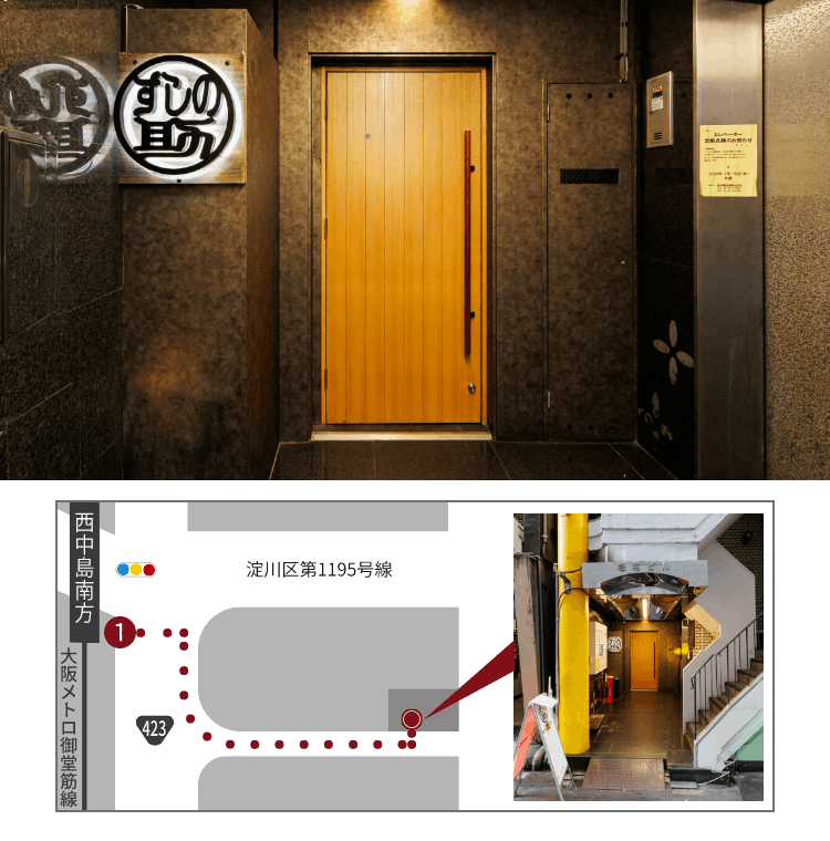 「Osaka Metro御堂筋線・西中島南方駅1番出口を出て、西中島3〜7丁目方面へお進みください。1つ目の角を左に曲がっていただくと、約80mほど先の「寿ビル1階」にございます。ビル前の「すしの助」の看板も目印です。